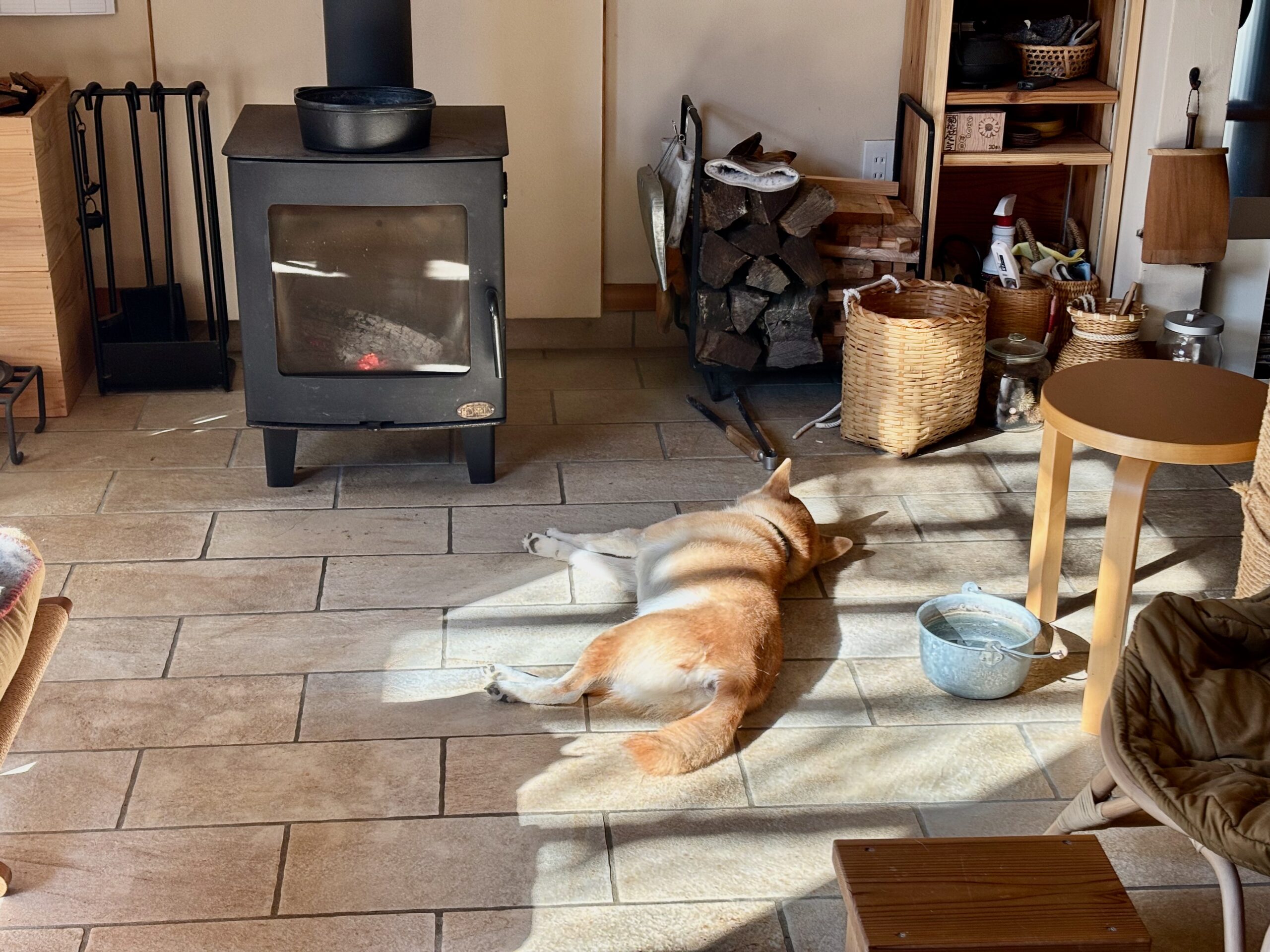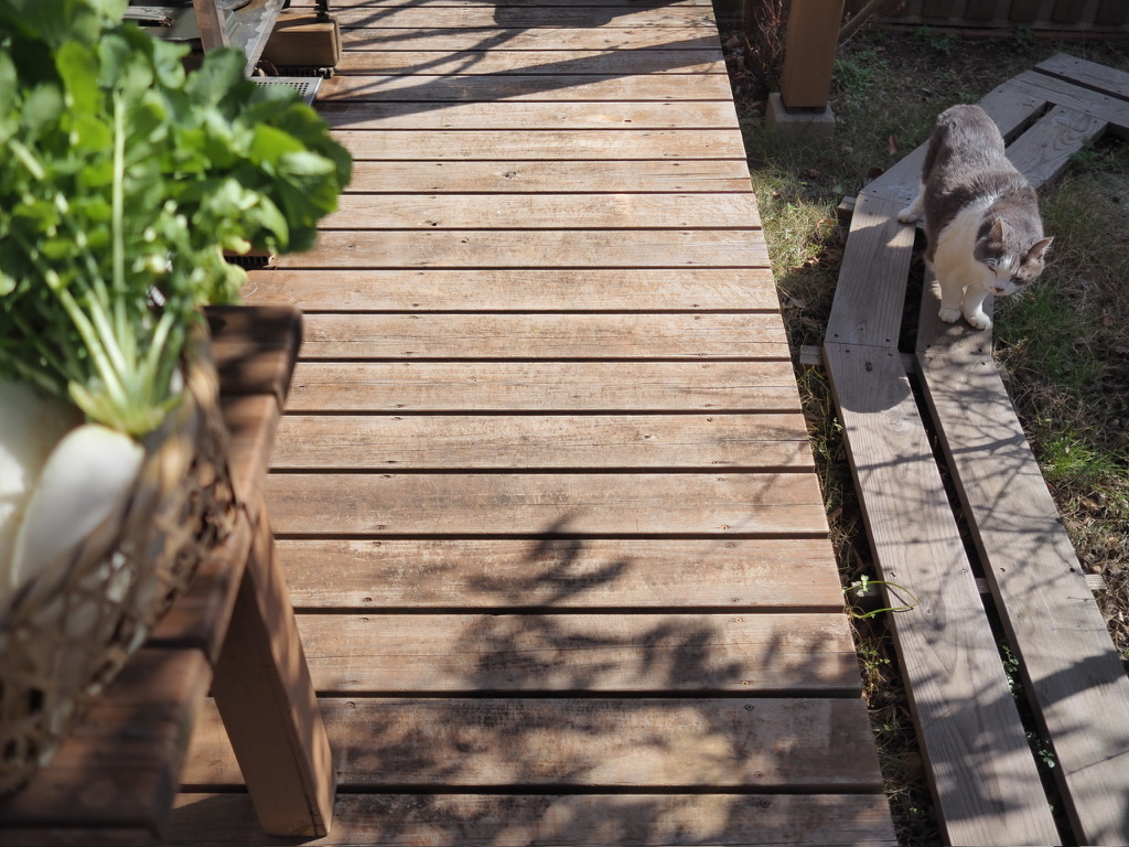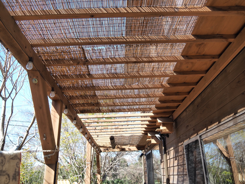 夏の日差し対策につけたスダレですが、冬の間も、屋根のところだけ掛けて巻き上げておくようにしてみました。日差しが強く感じられるような今時期に、マイルドに眩しさをカットしてくれるので、とても良い感じ。